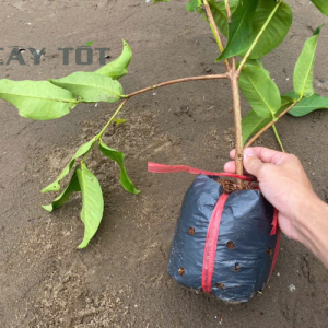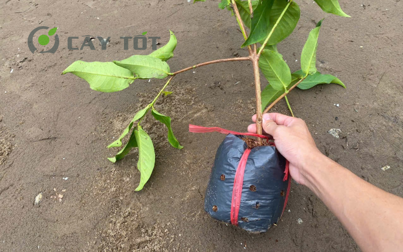 Sau khi trồng, cần dùng 1–2 cọc tre hoặc gỗ cắm chéo để cố định cây, giúp cây đứng vững, tránh bị nghiêng đổ khi gặp gió to, mưa bão. Buộc dây mềm (dây nilon, dây vải) vào thân cây với cọc, tránh buộc quá chặt gây xước thân. Việc chống cọc không chỉ giúp cây không đổ mà còn giúp rễ phát triển thẳng đều, tạo bộ rễ vững chắc, thuận lợi cho giai đoạn chăm sóc thúc trái về sau.