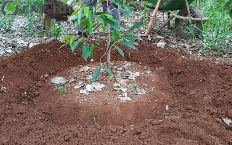 Đối với những khu vực vùng núi cao, bà con có thể kết hợp việc đánh bồn xung quanh gốc cây. Cách này sẽ giúp quá trình tưới tiêu và giữ nước thấm vào đất dễ dàng hơn, đảm bảo cây sầu riêng phát triển khỏe mạnh.