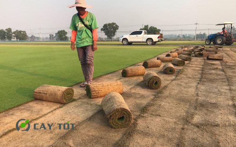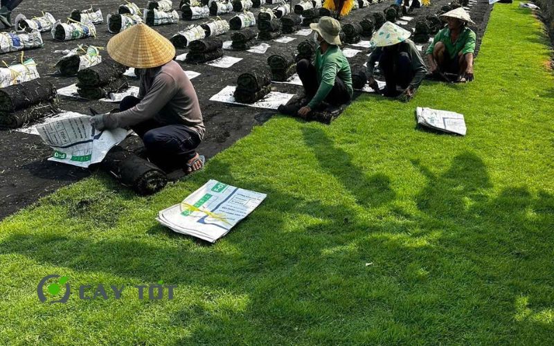 Rải nguyên thảm cỏ phủ kín toàn bộ diện tích cần trồng.